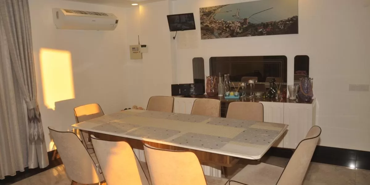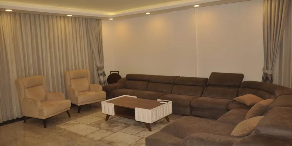 - مطبخ مجهز بـ(أرضيات غرانيت، خزائن، طباخ، شفاط، فرن، ترس، حوض للجلي)