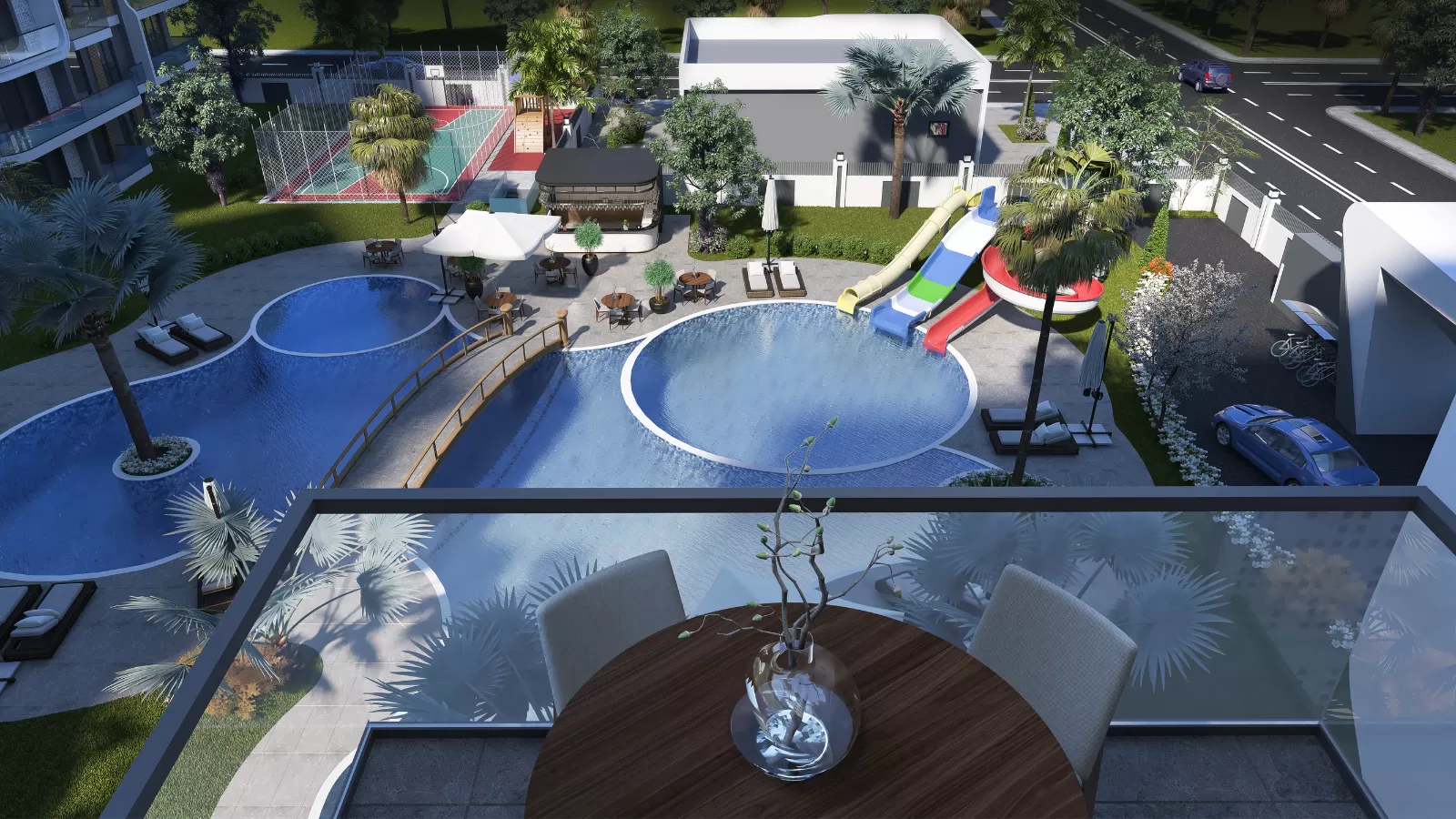 - ملعب للأطفال و ملعب كرة طائرة و ملعب كرة سلة و ملعب تنس.