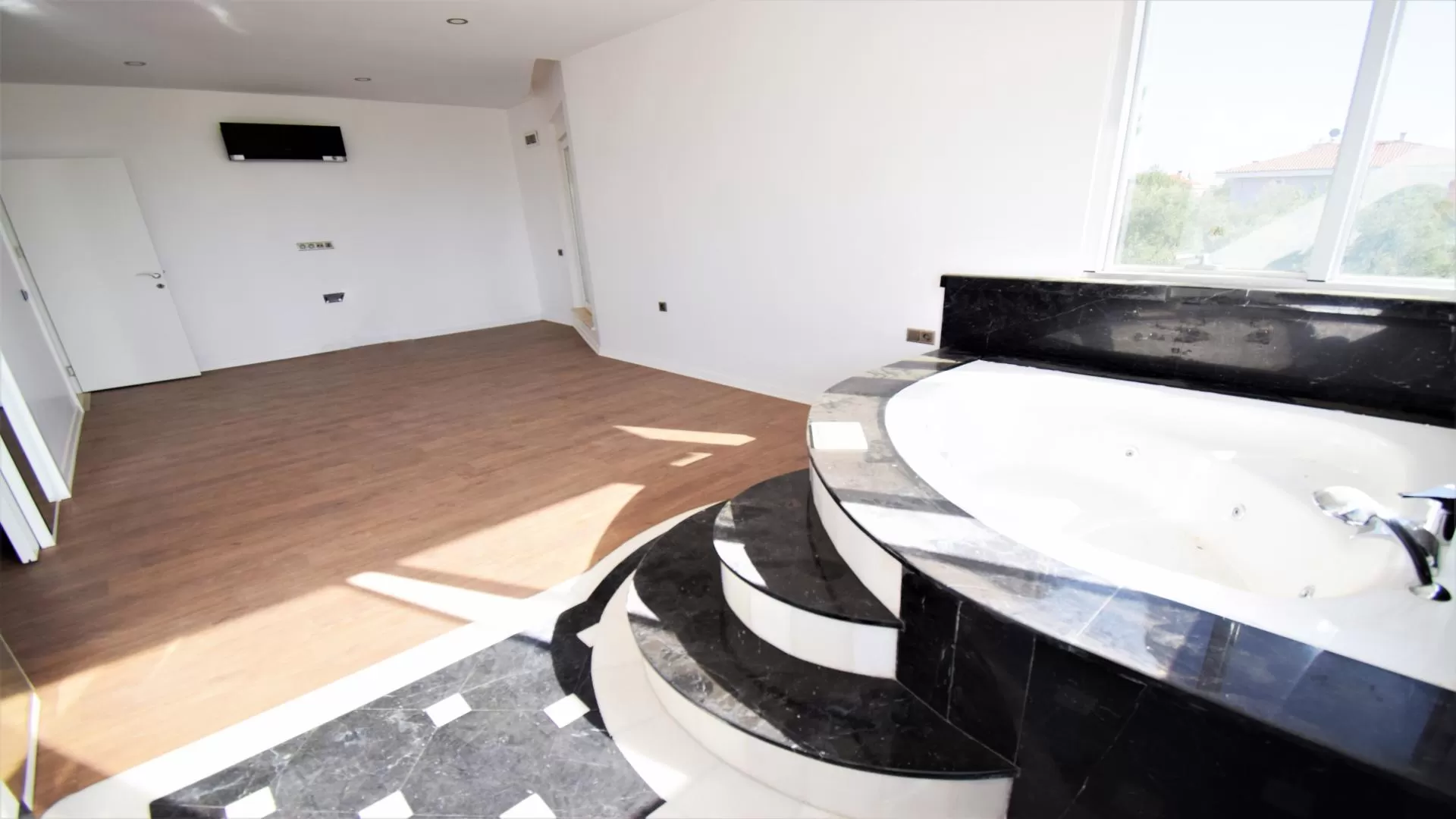 The Triplex villa is 500 M2 area, consists of Seven Bedrooms, Two Living rooms and Seven Bathrooms. The master bedroom includes Jacuzzi, Dressing Room and En-suit Bathroom.